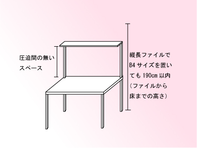 本の収納スペースも欲しいけど机に座ったときの圧迫感が無いように、できるだけ部屋の梁、上ギリギリに本を置く棚が欲しい。B4のファイルが立てて置けるスペースを。それで机の奥行きは70cmぐらいで・・・・
