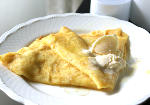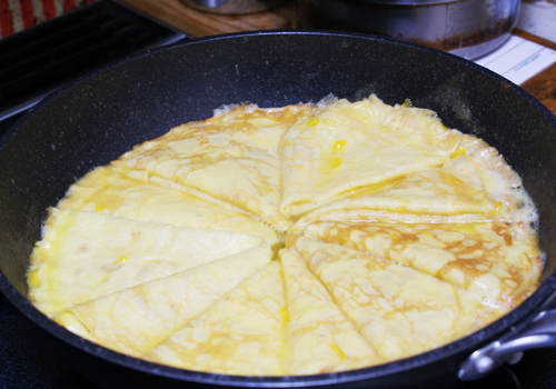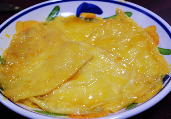作り方は、クレープ焼いて、オレンジ絞って、オレンジの汁をバターと交ぜて。フライパンでオレンジの汁とバターで軽く荷焼きする感じで完成。ああ、オレンジ風味のリキュールも入れて加熱でアルコールを飛ばす。